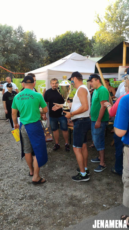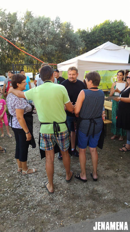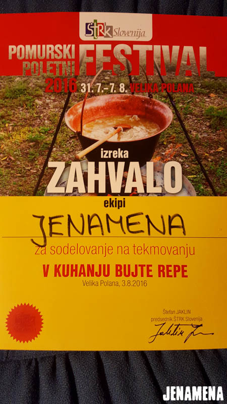 Jenamena kuharska ekipa v sestavi Marija in Martin Hanc kot glavna kuharja in Damijan Hozjan kot kurjač se je v sredo, 3. avgusta 2016, udeležila tekmovanja v kuhanju bujte repe na Pomurskem poletnem festivalu v Veliki Polani. Repa, ki so jo ponudili obiskovalcem, je bila že tradicionalno odlična in jo bo naša kuharska ekipa letos kuhala tudi na Jenamena fest-u. Kuharje je spremljala tudi močna spremljevalna ekipa rdečih jenamena majic. Imeli smo se krasno. Čestitke kuharski ekipi, ki je prejela priznanje za sodelovanje, in hvala vsem, ki ste nas prišli pozdravit in spodbudit na našo stojnico. Se vidimo kmalu na Jenamena festu …