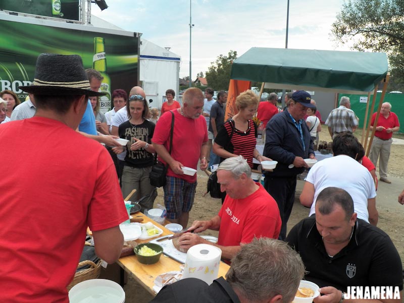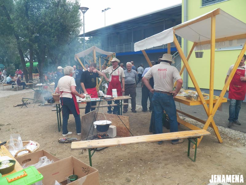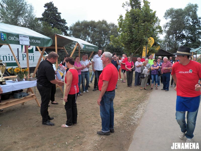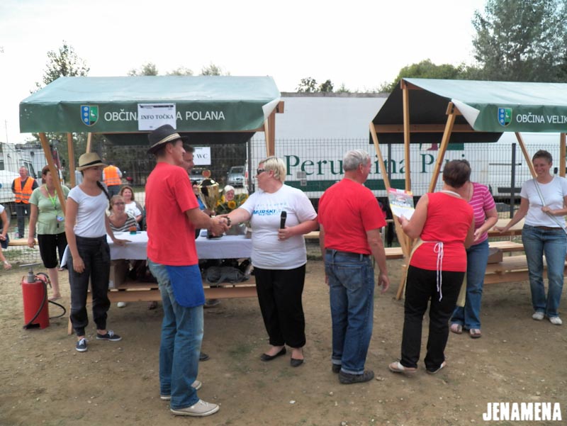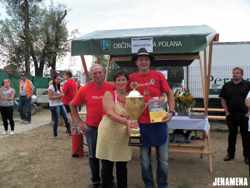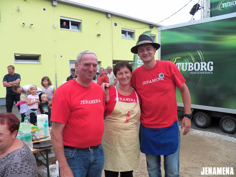 Tudi letos je ekipa JENAMENA sodelovala na tekmovanju v kuhanju bujte repe v okviru Pomurskega poletnega festivala v Veliki Polani. Glavni kuharici Mariji Hanc je pomagal njen mož Martin Hanc, za dobro vzdušje ob stojnici in kotlu je skrbel Damijan Hozjan. Podpret nas je prišlo veliko število ljudi, gneča pred našim kotlom repe je bila izjemno velika, zato je marsikdo, ki bi želel okusiti najboljšo bujto repo, ostal brez nje. Odločili smo se, da bomo mnogim interesentom Maričkine bujte repe ustregli že v okviru letošnjega Jenamena fest-a. Ekipi Jenamena se zahvaljujemo za sodelovanje in promocijo festivala in ISKRENO ČESTITAMO ob izjemnem uspehu – ponovni osvojitvi velikega pokala in razglasitvi najboljše bujte repe v Veliki Polani že drugo leto zapored. Hvala tudi vsem Jenamena navijačem in podpornikom. JENAMENA REPA J